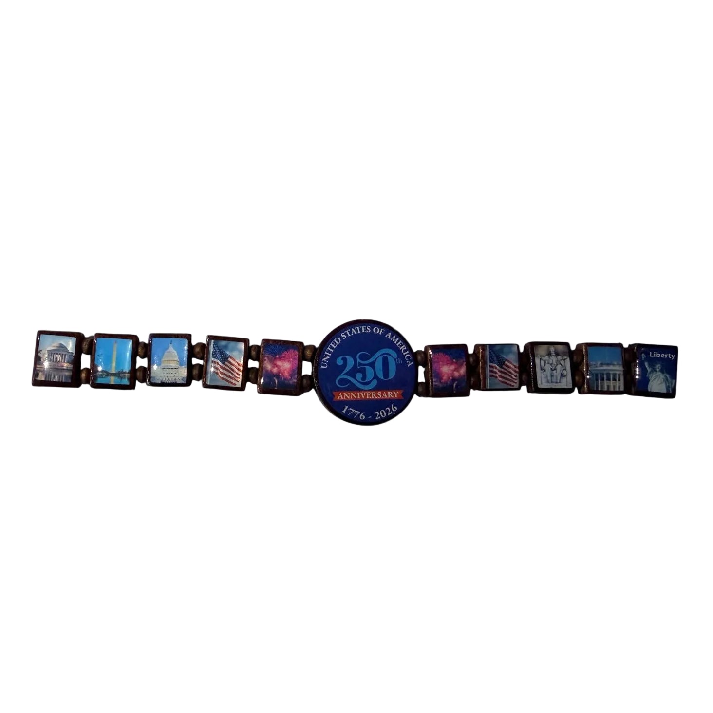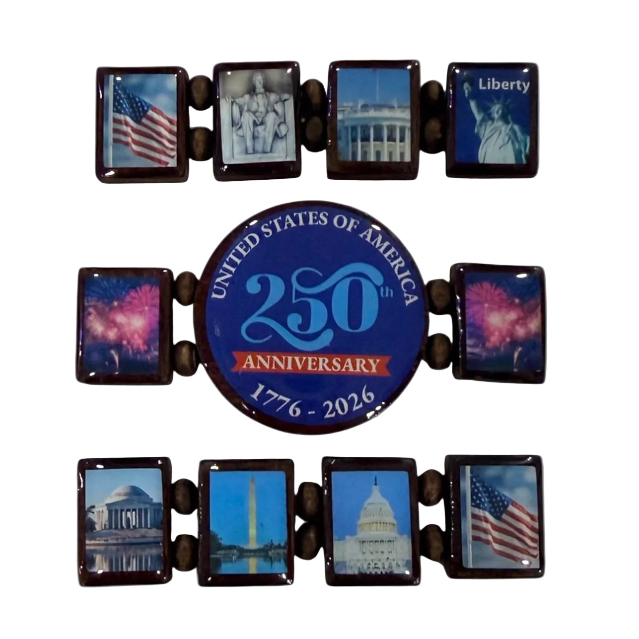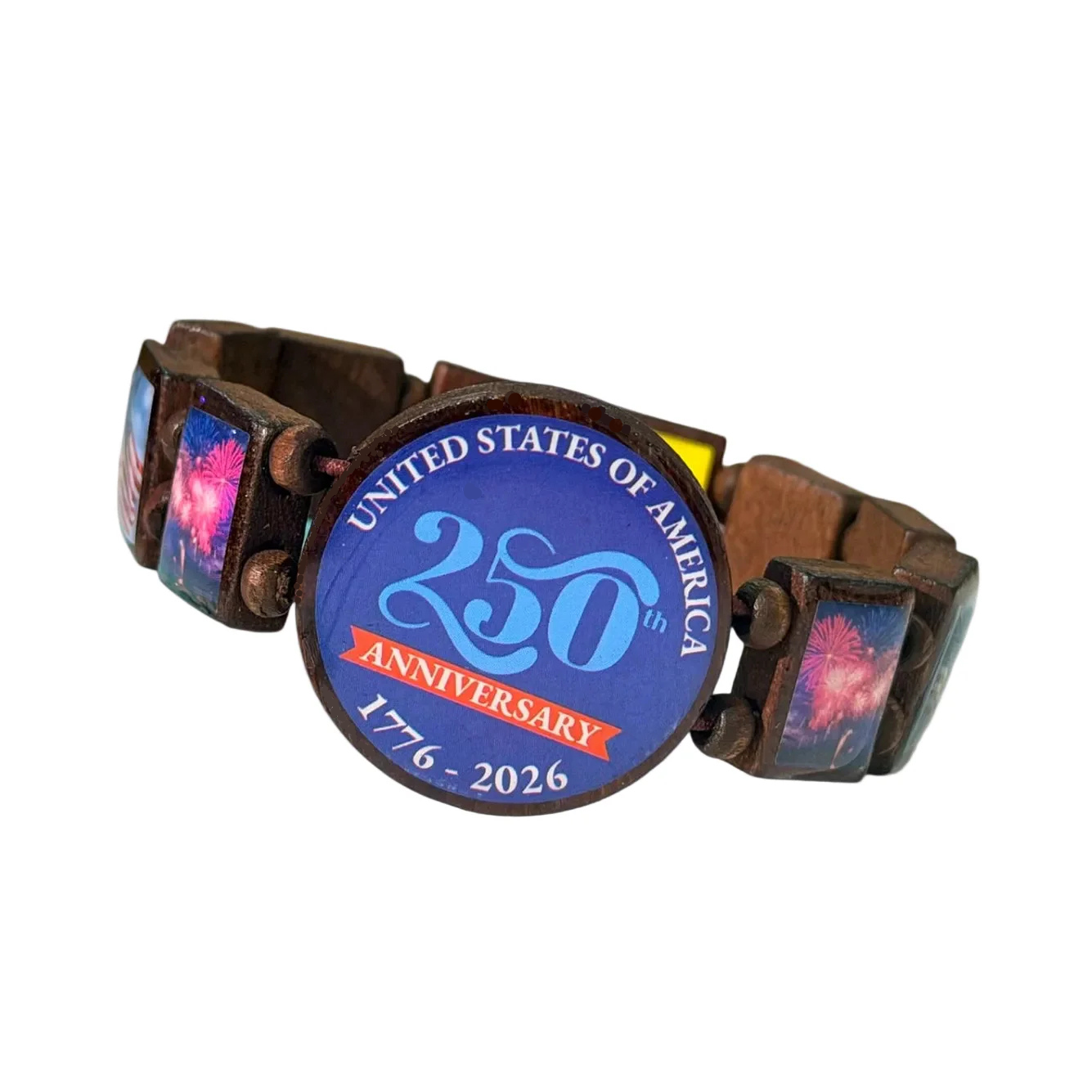 Celebrate 250 years of American history with this limited-edition Wrist Story USA 250th Anniversary Bracelet. Handcrafted from natural wood, this meaningful bracelet features 10 classic story tiles paired with an oversized circular “250th” centerpiece that honors the nation’s milestone anniversary.